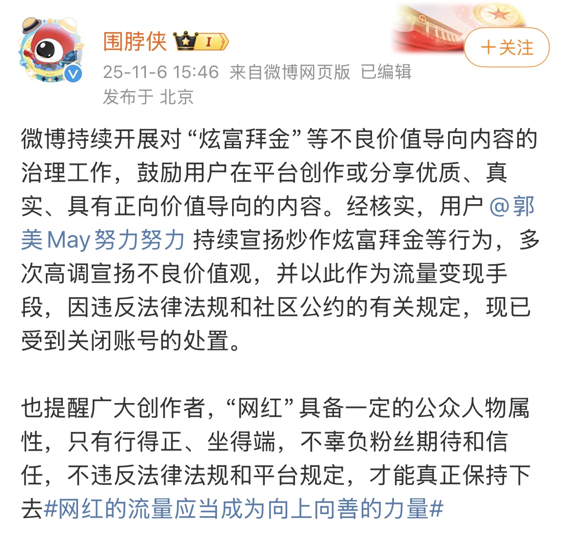 网红想靠“炫富”来致富,对不起,此路不通。及时叫停劣迹网红的复出路,既需平台坚守审核底线,更需制度形成长效震慑。唯有如此,才能让流量回归正向价值轨道,让网络空间正本清源。
